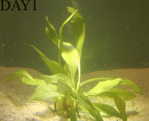 Testaquarium 2: Verlichting op basis van een 20W halogeen spot plus een blauwe LEDspot. Duidelijke vorming van nieuwe bladeren, maar ook een explosieve algengroei.