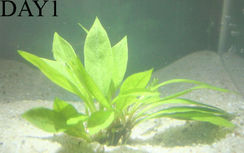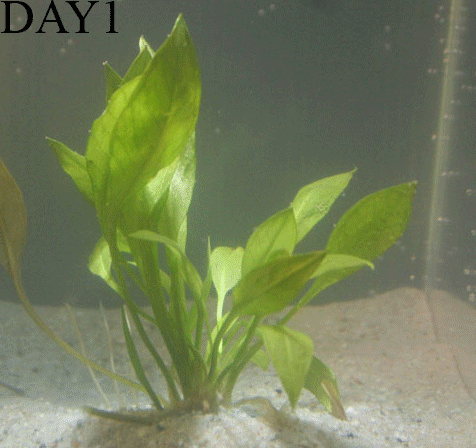 Hieronder zijn een viertal animaties te bekijken (nu dag 1 t/m dag 20 - begin tot einde test) van de plantengroei in elk testaquarium. Het eerste en laatste frame zijn 2 seconden in beeld, de overige beelden (1 per dag) zijn 0.2 seconden zichtbaar. Heb geduld! Het kan soms lang duren voordat de animaties geladen zijn (afhankelijk van de snelheid van je internet connectie):
